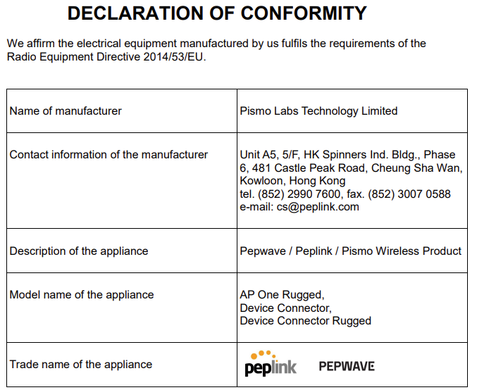 CE Statement for Pepwave Routers ( AP One Rugged )