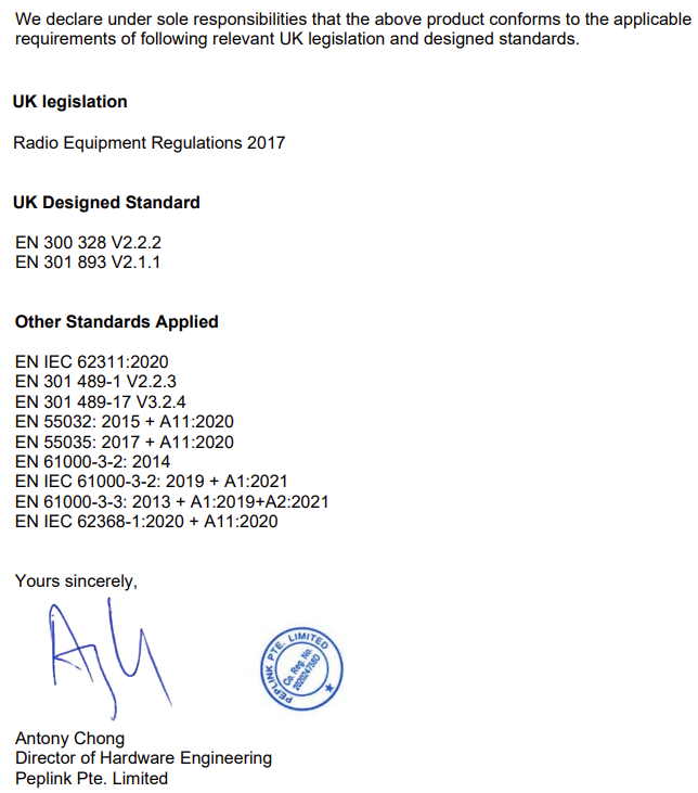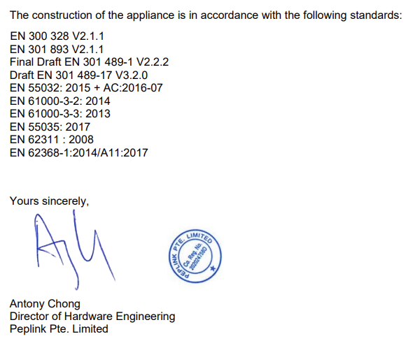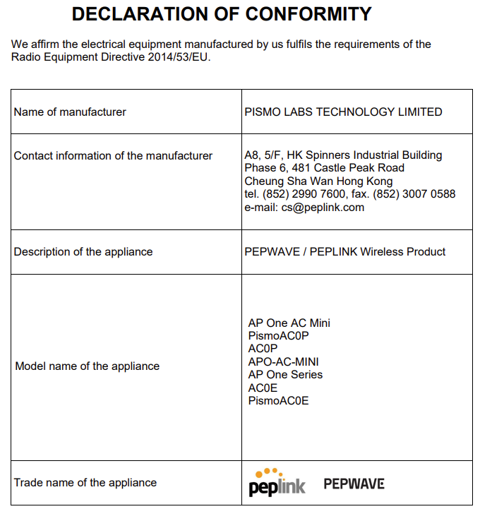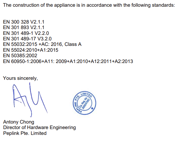CE Statement for Pepwave Routers ( AP One Enterprise )