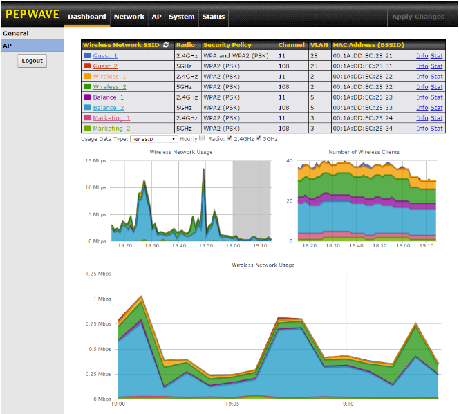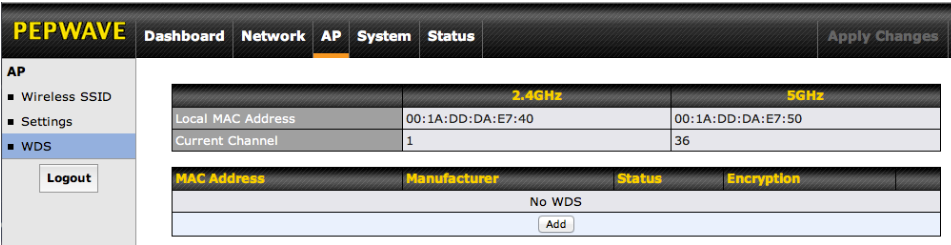 Here you can monitor the status of your wireless distribution system (WDS) and track activity by MAC address. If you’re using the AP One Mini, this section will display information for both the 2.4GHz and 5GHz radios.