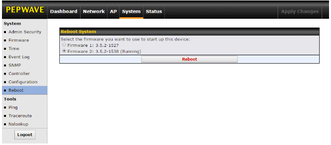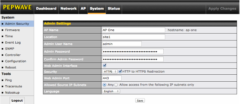 - After logging in, the Dashboard appears. Click the System tab to begin setting up your access point.