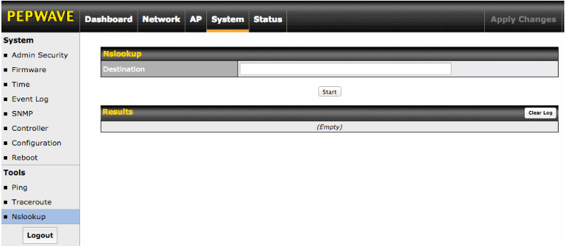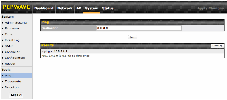 The ping test tool tests connectivity pinging the specified destination IP address. The ping utility is located at System>Tools>Ping.