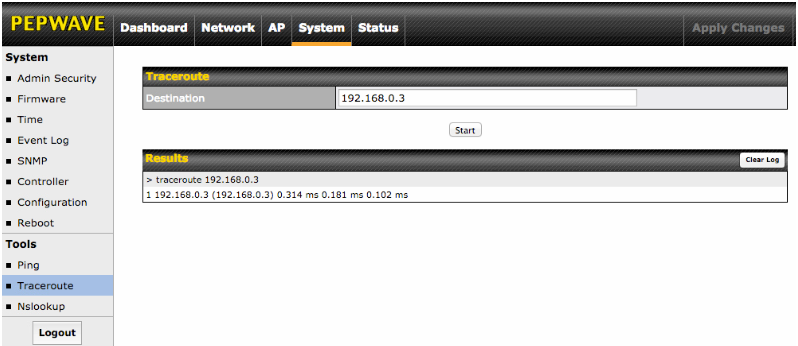 The traceroute test tool traces the routing path to the specified IP address. The traceroute test utility is located at System>Tools>Traceroute.