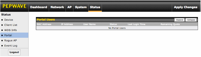 If you’ve turned on your access point’s captive portal, client connection data will appear here. Use the Expand and Collapse buttons to control the amount of data displayed.